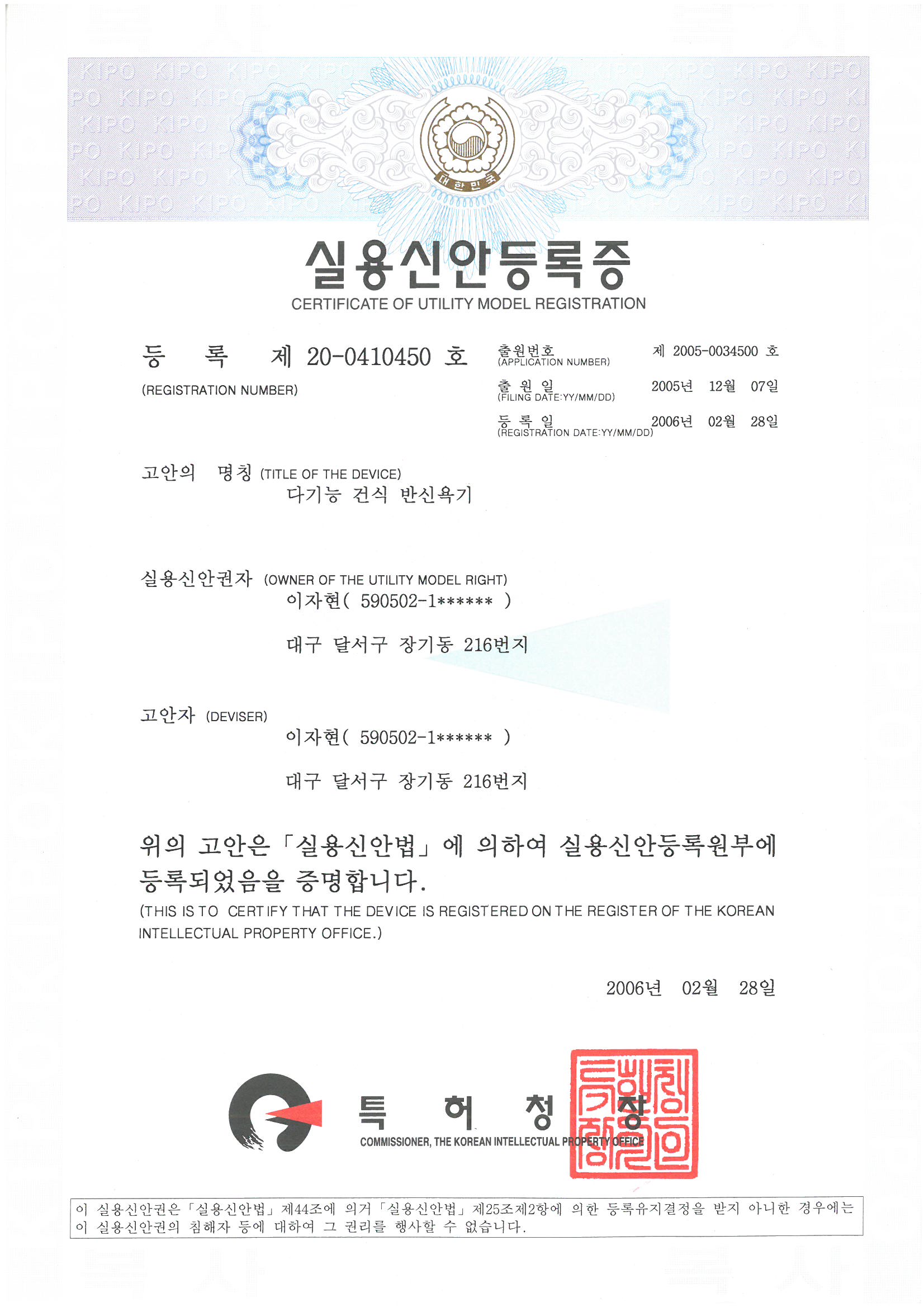 디자인등록증(제 30-0667809호)
