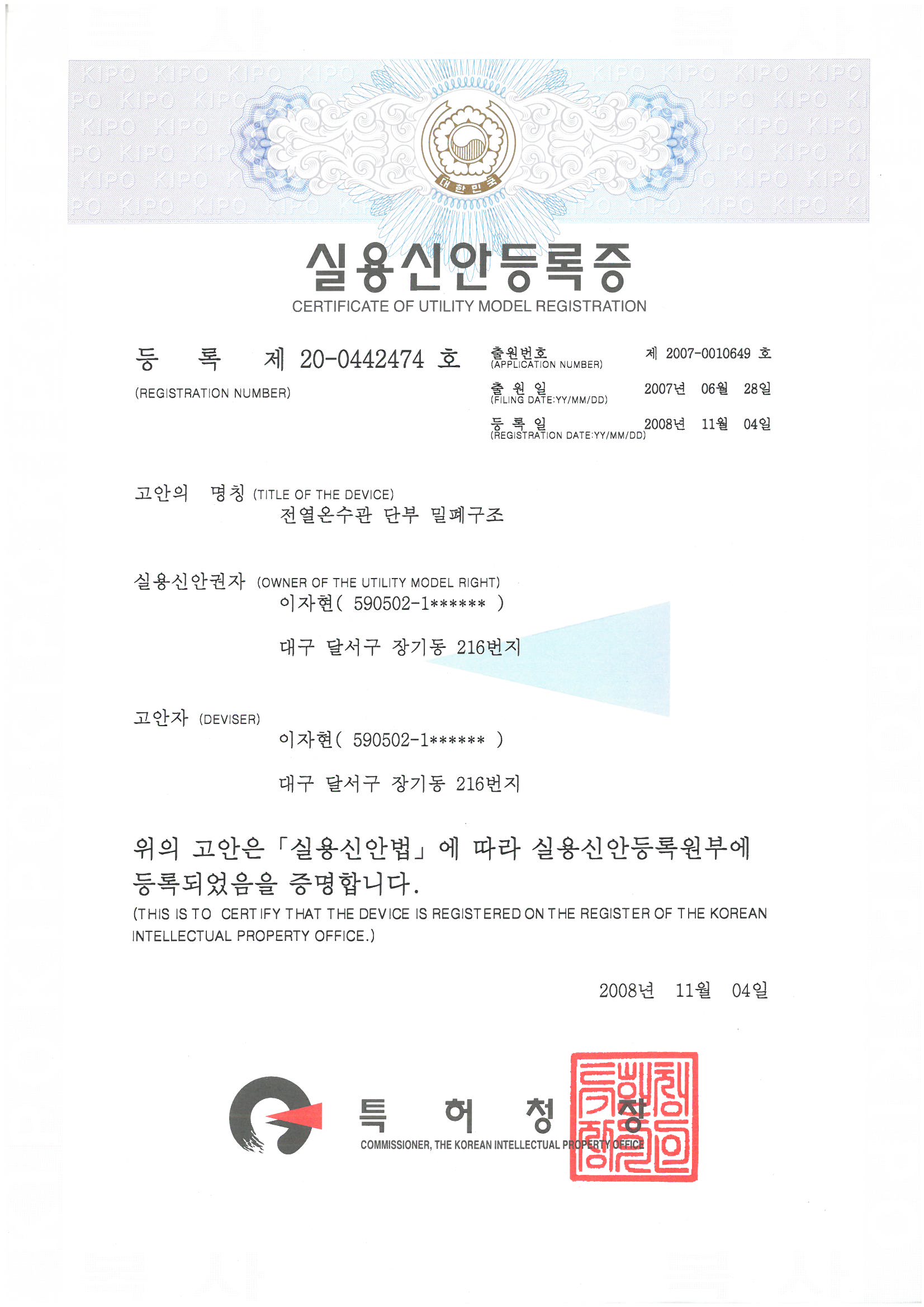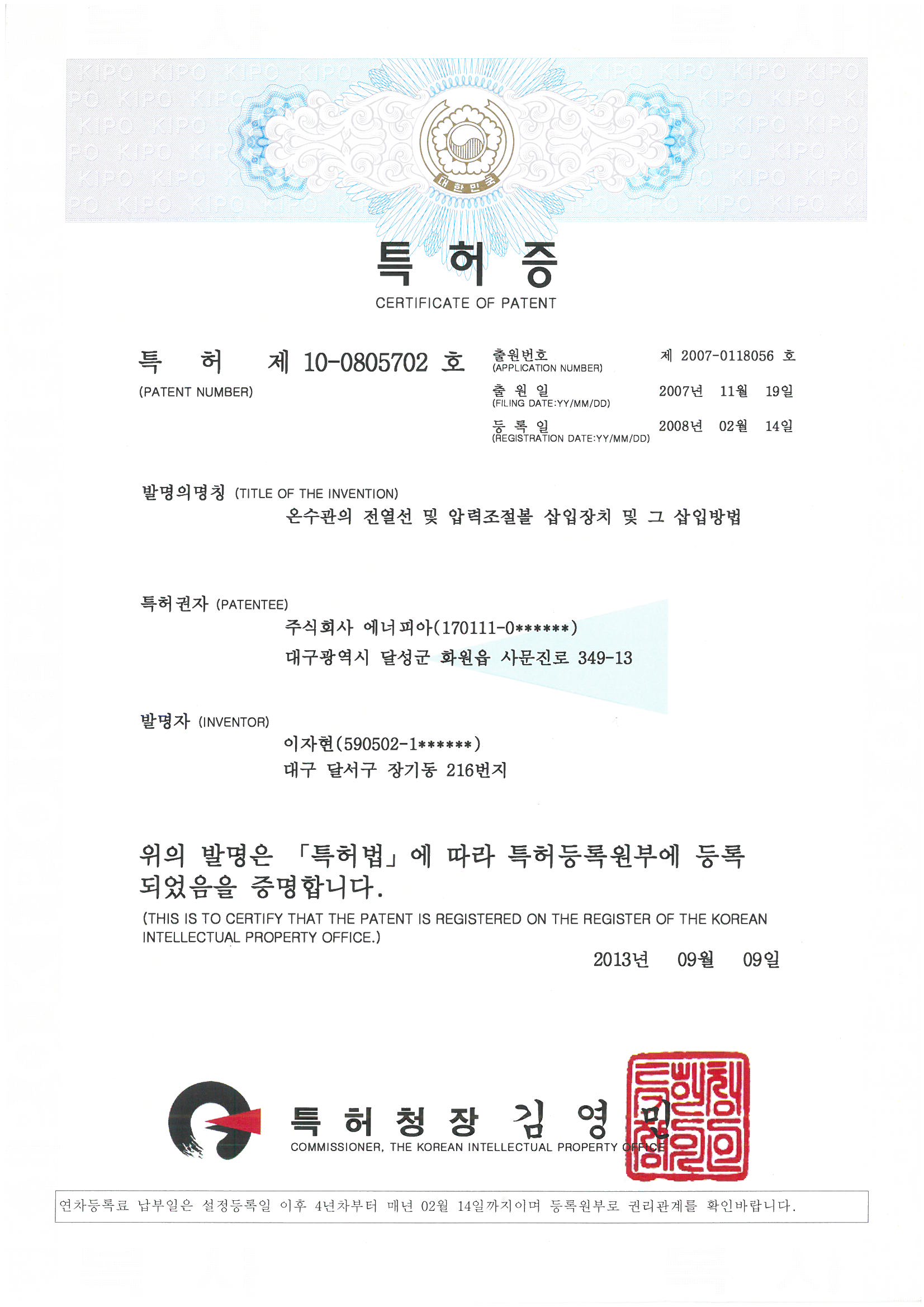 특허증 (제10-0805702호) 온수관의 전열선 및 압력조절볼
