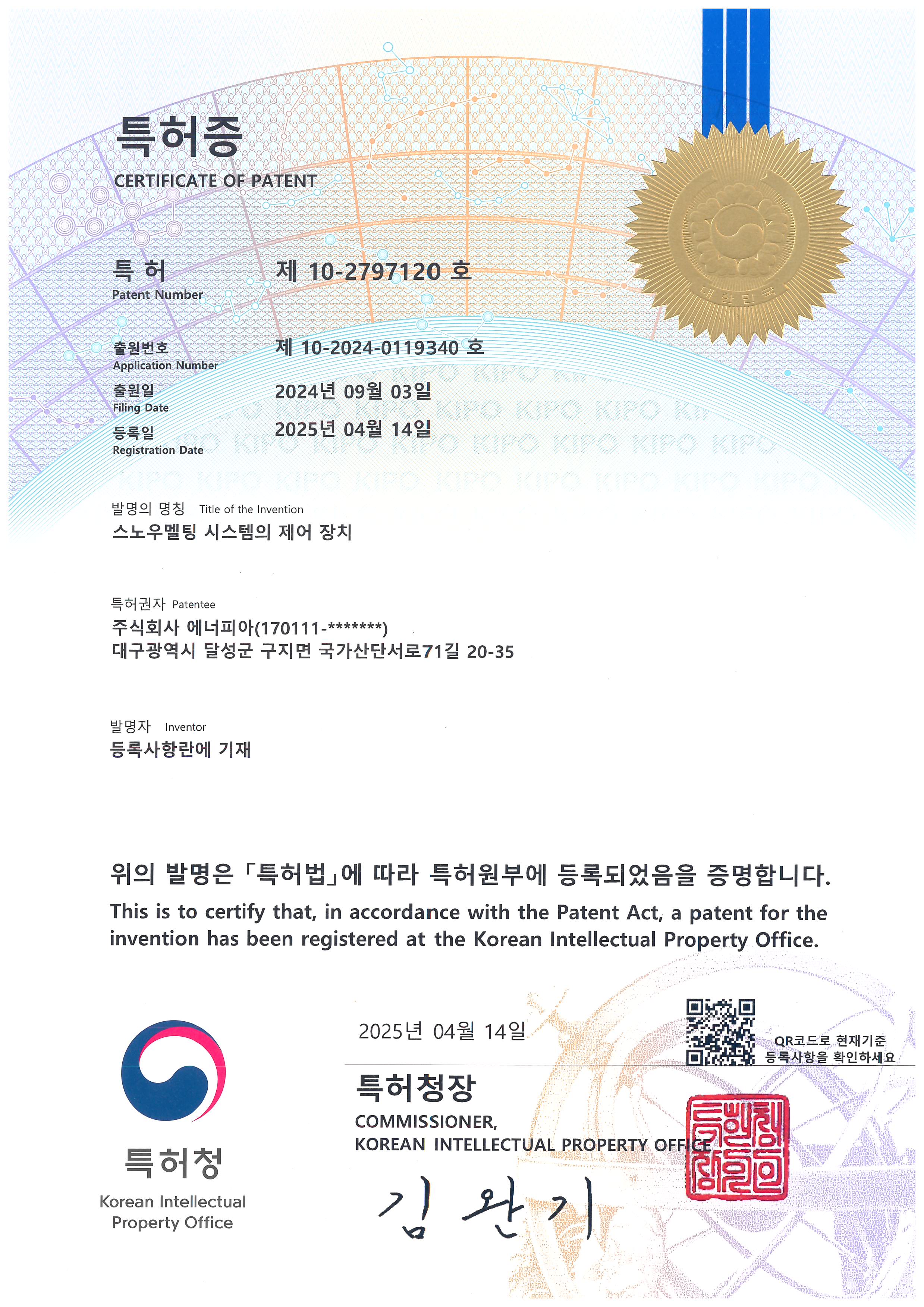 특허 제-10-1792709호 (지온센서와 융설시스템 및 제어방법)