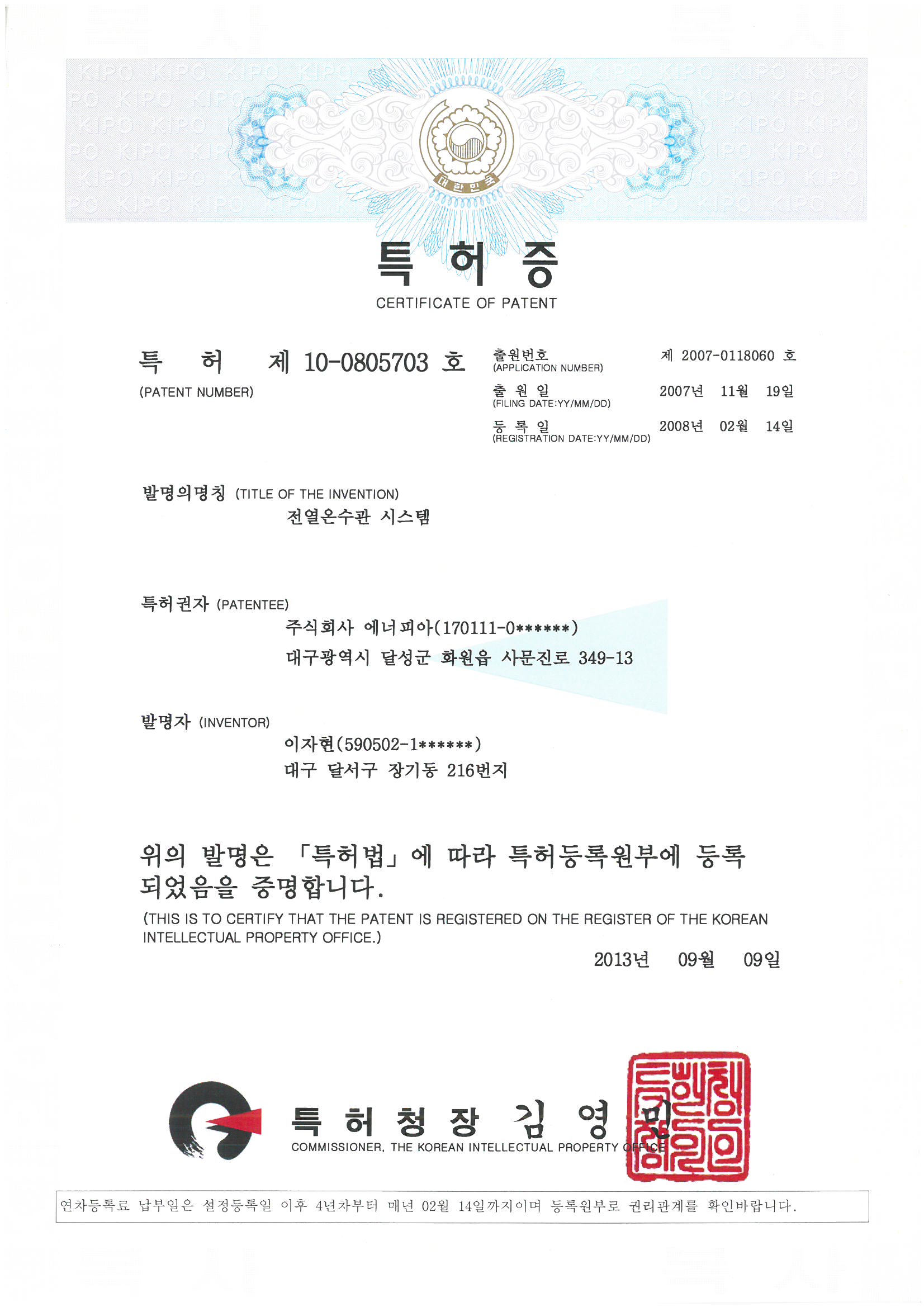 특허 제10-0805703호(전열온수관시스템)