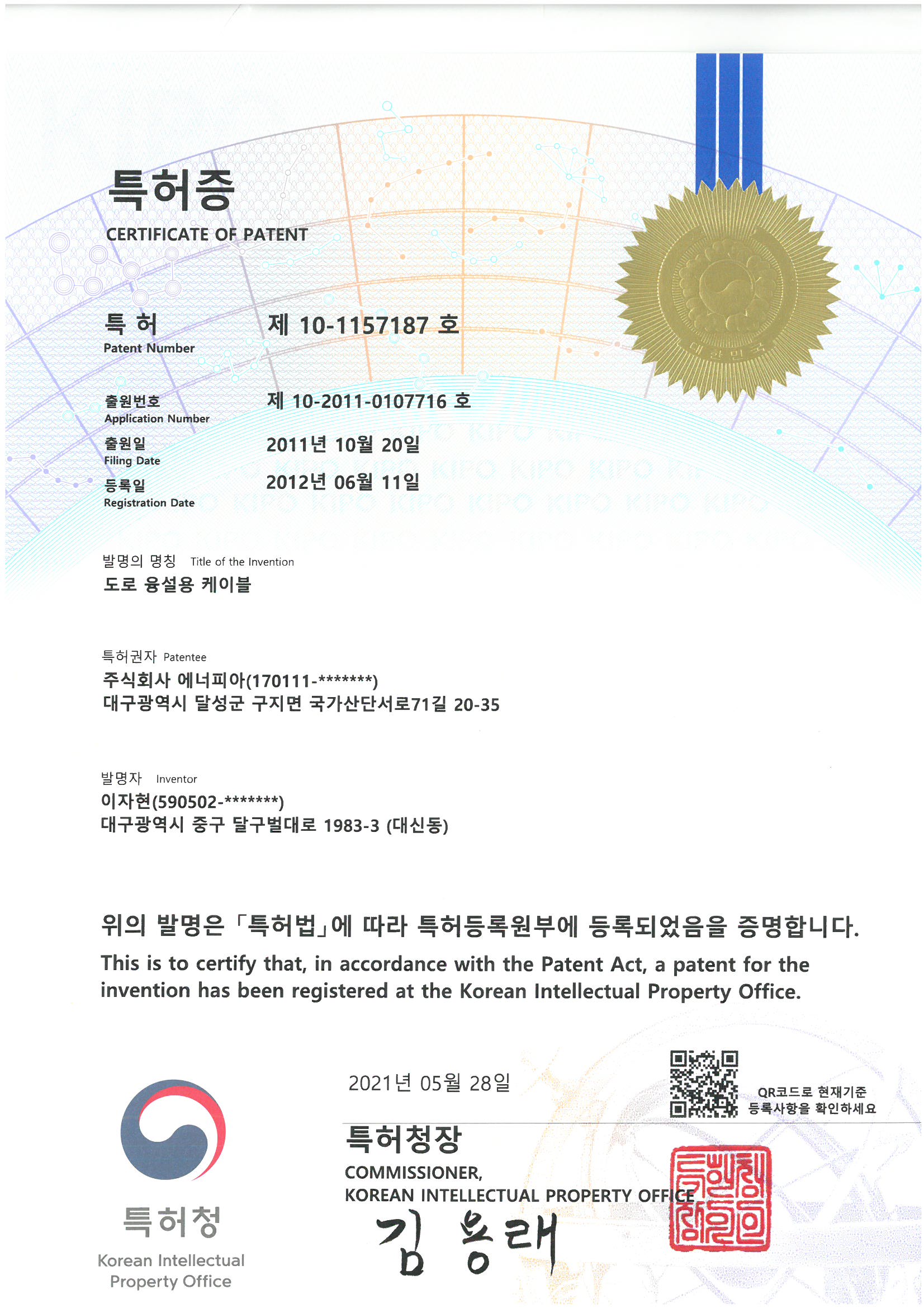 특허 제10-1157187호(도로융설용 케이블)