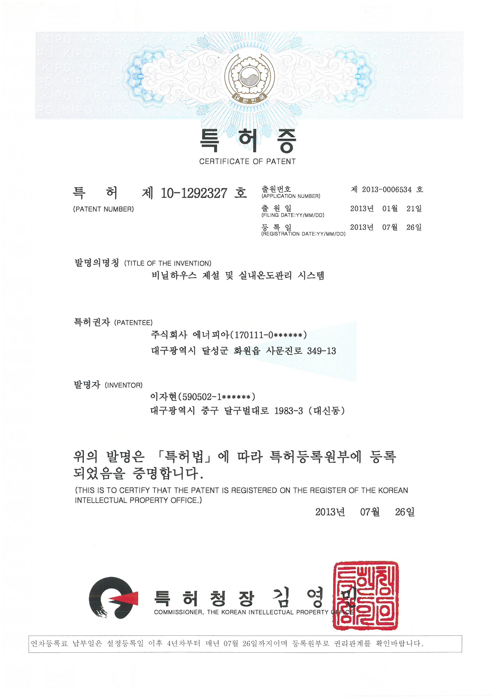 특허 제 10-1292327호(비닐하우스 제설 및 실내온도관리 시스템)