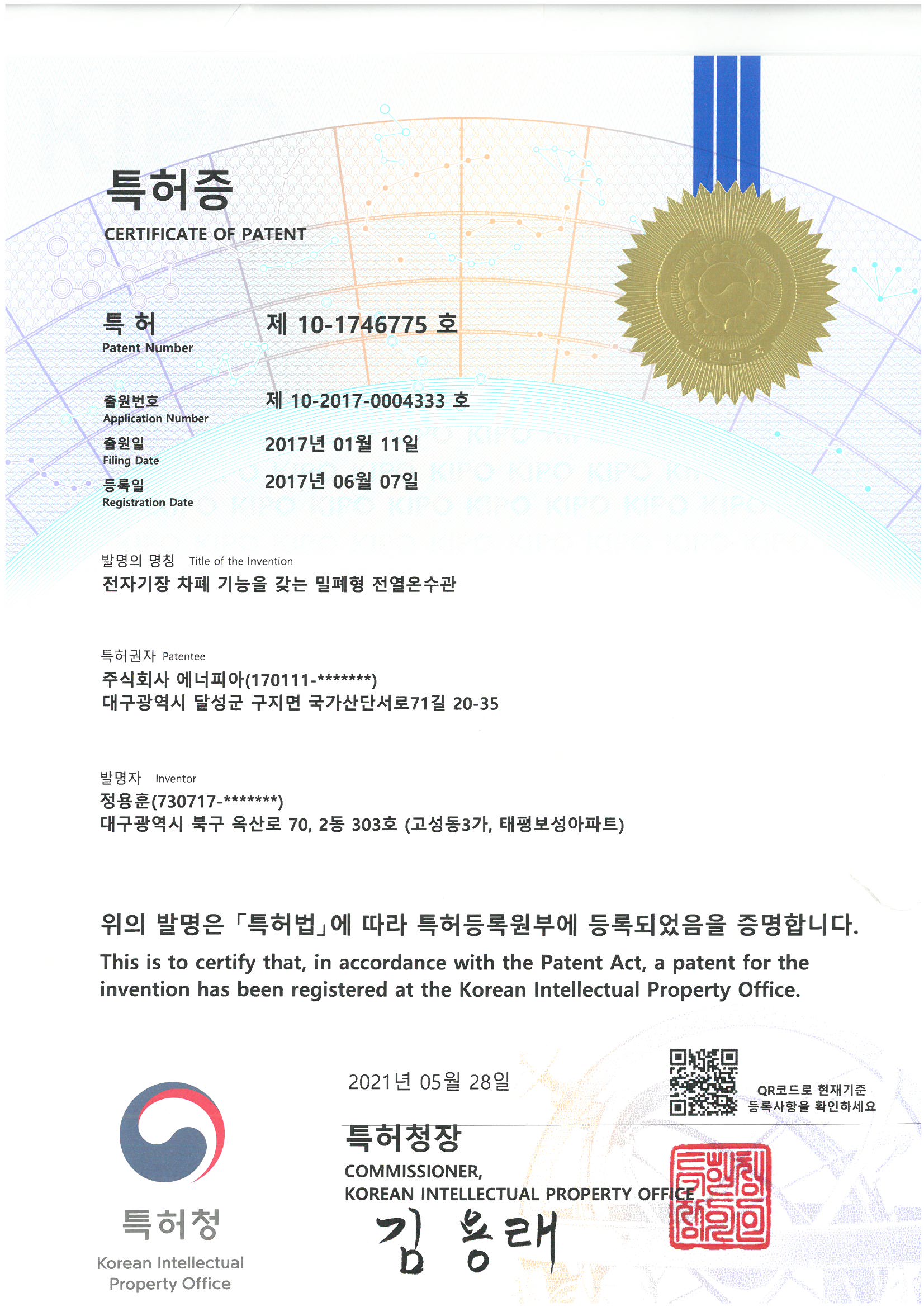 특허제 10-1746775호 (전자기장-차폐 기능을 갖는 밀폐형 전열온수관)