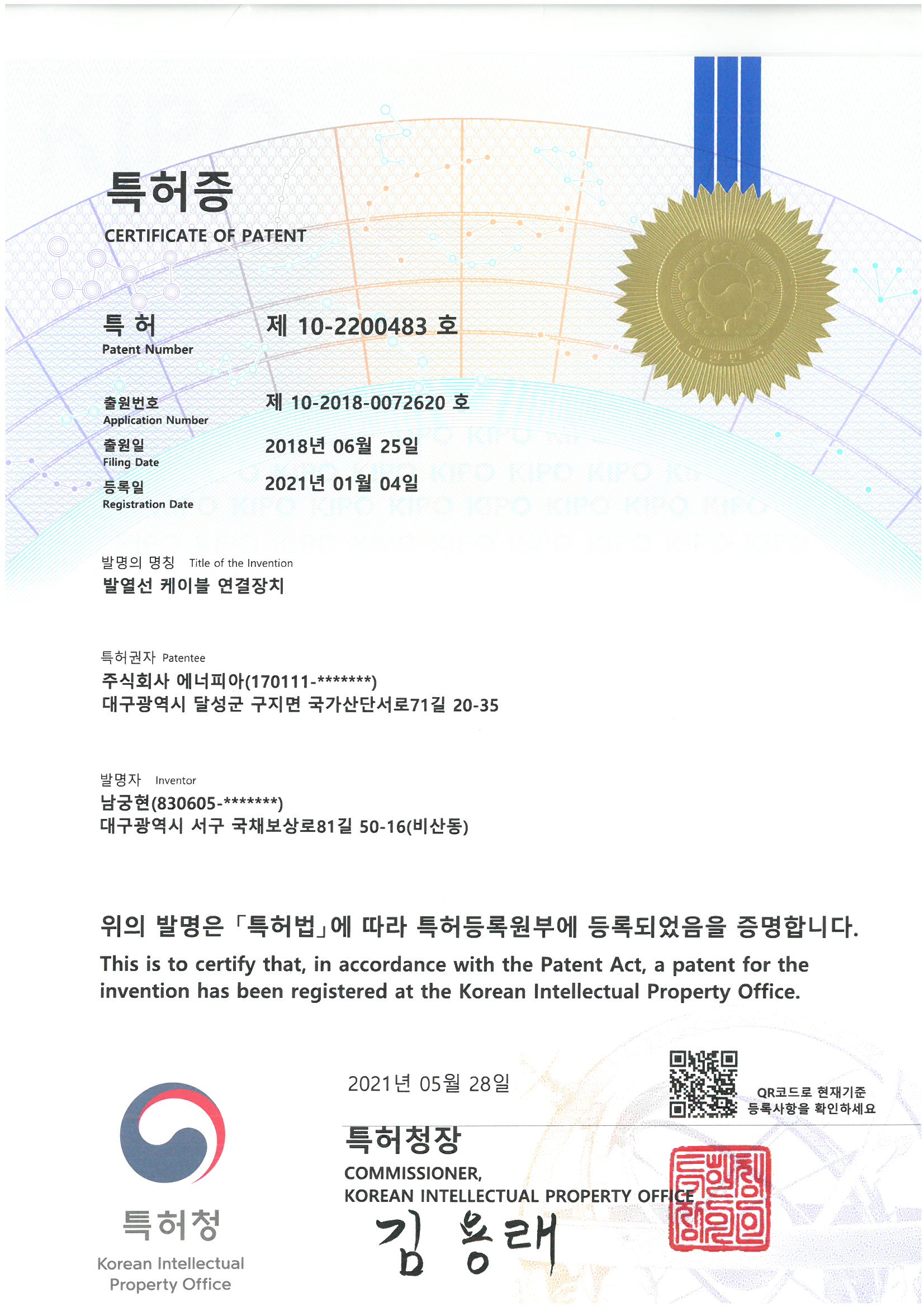 특허-제10-2200483호 (발열선 케이블 연결장치)