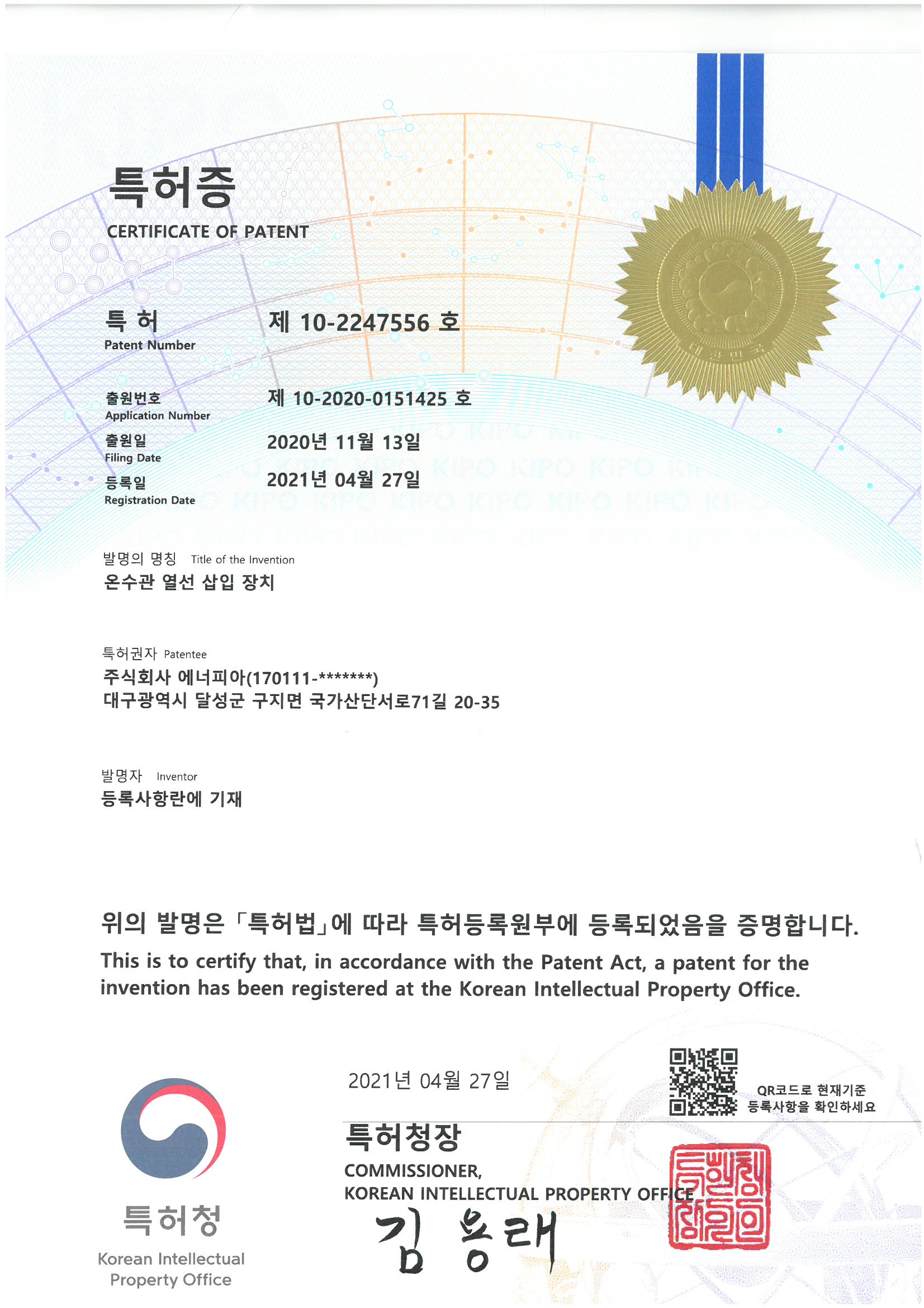 특허-제10-2247556호 (온수관 열선 삽입 장치)