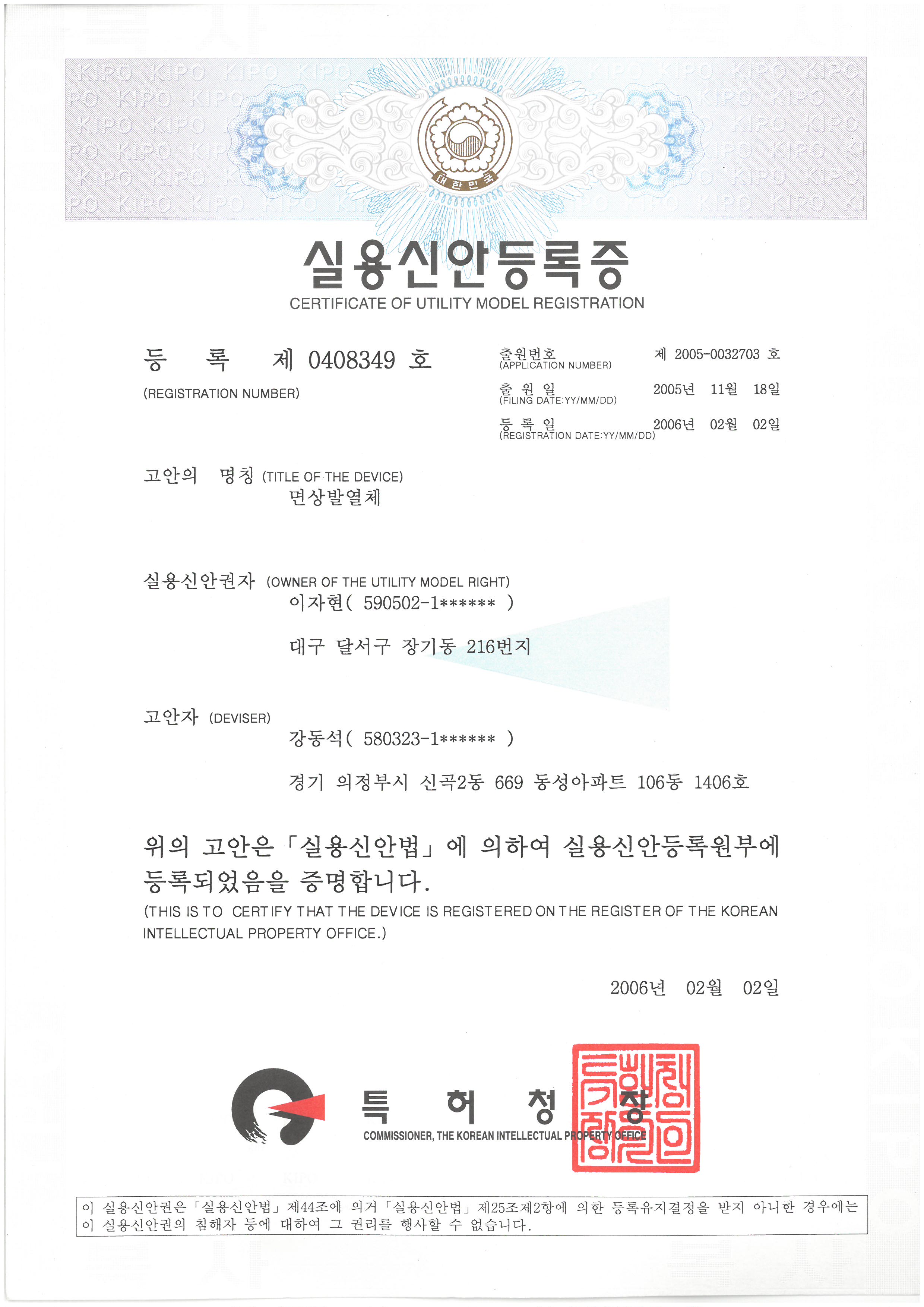 실용신안(제-0408349호) 난방필름첨부