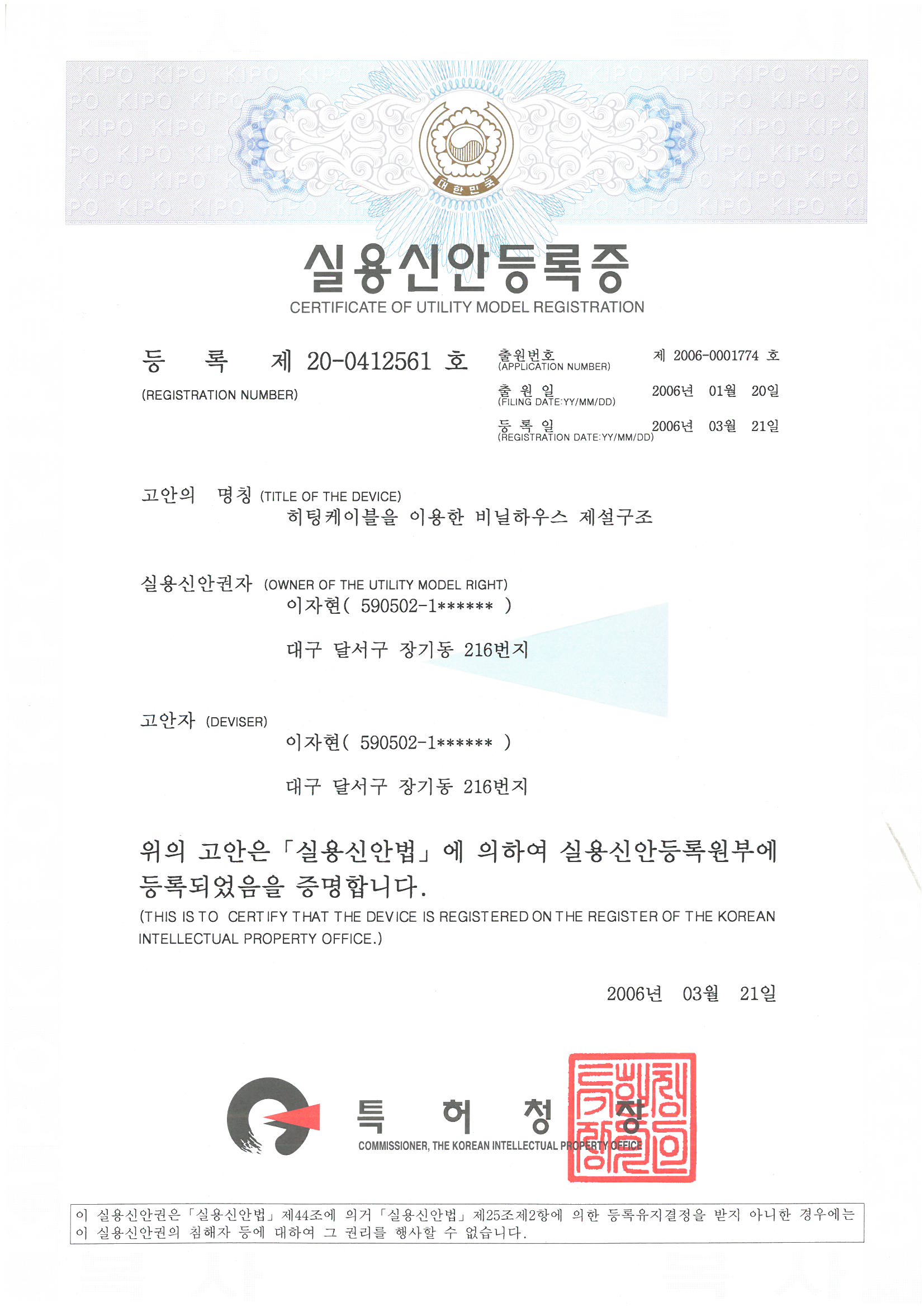 디자인등록증(제 30-0667809호)